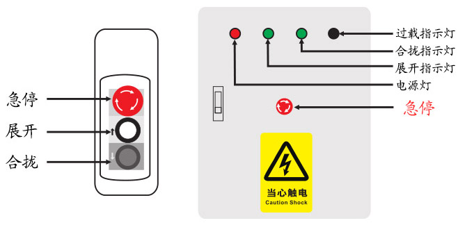 注:手柄開關(guān)使用方法為點動。長按合攏按鈕即可合攏,當(dāng)看臺徹底合攏時,觸碰到限位開關(guān)會自動停止。